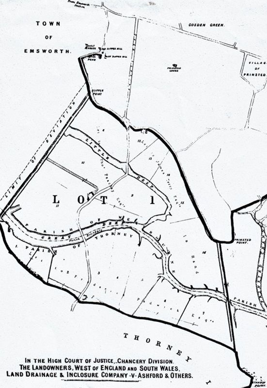 Whether as a consequence, efforts were made to join the Island to the mainland by building revetments across from Thornham to North of Stanmore Pt and from Emsworth Ponds to Wickor Pt. Compare the 1820 map of the Island with the one below in the 1930s. An extract of an Auction Notice of 1882 shows the reclaimed land as Lot 1.
