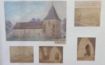 This last panel shows St Nicholas from the North, before the large yews had established. That North door has since been replaced by the RAF Window. In time we hope to place these images in their own pages on the website.