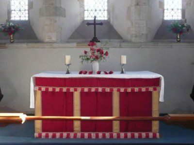 The liturgical colours are changed through the church year, the red being used for Remembrance Sunday. White signals festivals like Christmas, Easter and thro' Pentecost to Ascension; purple for seasons of Epiphany and Lent. Green takes through the summer months of Trinity, which is why green is our most faded of the altar frontals.