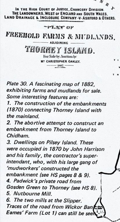 Whether as a consequence, efforts were made to join the Island to the mainland by building revetments across from Thornham to North of Stanmore Pt and from Emsworth Ponds to Wickor Pt. Compare the 1820 map of the Island with the one below in the 1930s. An extract of an Auction Notice of 1882 shows the reclaimed land as Lot 1.